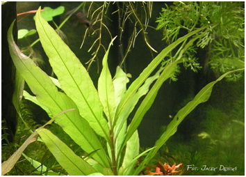 Êðàñèâîå è ïîïóëÿðíîå ðàñòåíèå. Äîñòèãàåò çíà÷èòåëüíûõ ðàçìåðîâ è ìîæåò âûõîäèòü èç âîäû. Äëÿ âûðàùèâàíèÿ íóæåí áîëüøîé àêâàðèóì îò 200 ë. Íà ïðî÷íîì ñòåáëå ðàñïîëîæåíû ïîïàðíî îâàëüíûå îñòðîêîíå÷íûå ñâåòëî-çåëåíûå ëèñòüÿ, ñåðåáðèñòûå ñ èçíàíêè. Äëèíà ëèñòüåâ äî 12 ñì, øèðèíà äî 4 ñì.